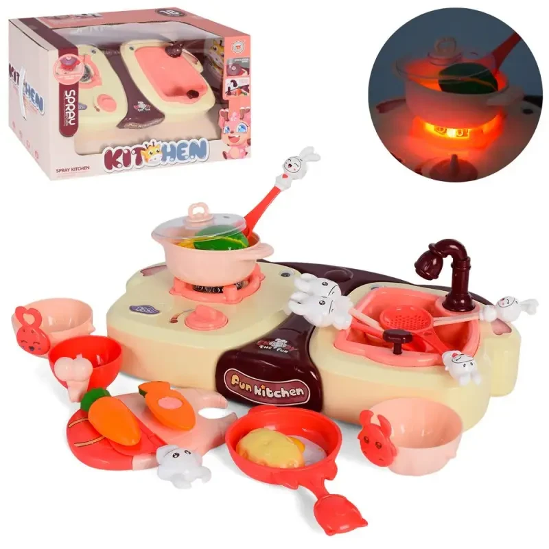 Дитяча ігрова кухня B02 стане чудовим подарунком для дівчинки віком від 3х років. У наборі є все, що потрібно для сюжетної гри: плита з підсвічуванням та емітацією пари, миття з функцією подачі води, посуд та кухонне приладдя. У процесі гри можна по-справжньому помити посуд, для цього потрібно залити склянку води в мийку, і при натисканні на кран з неї починає текти вода. Працює цей чудовий дитячий ігровий набір від батарейок.